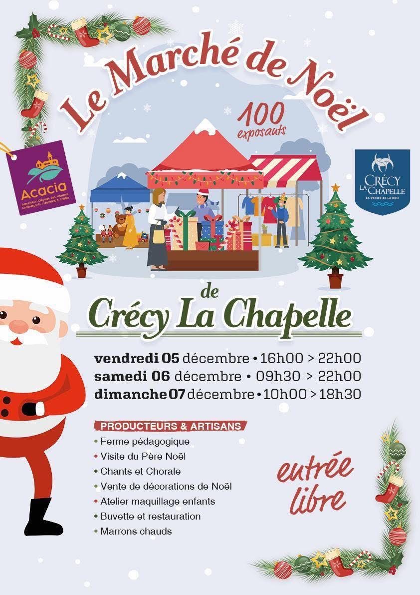 La Ville de Crécy-la-Chapelle organise du 5 au 7 décembre 2025 son Marché de Noël avec plus de 100 exposants. Nous pourrons nous y retrouver en compagnie d'artisans, créateurs et producteurs locaux.